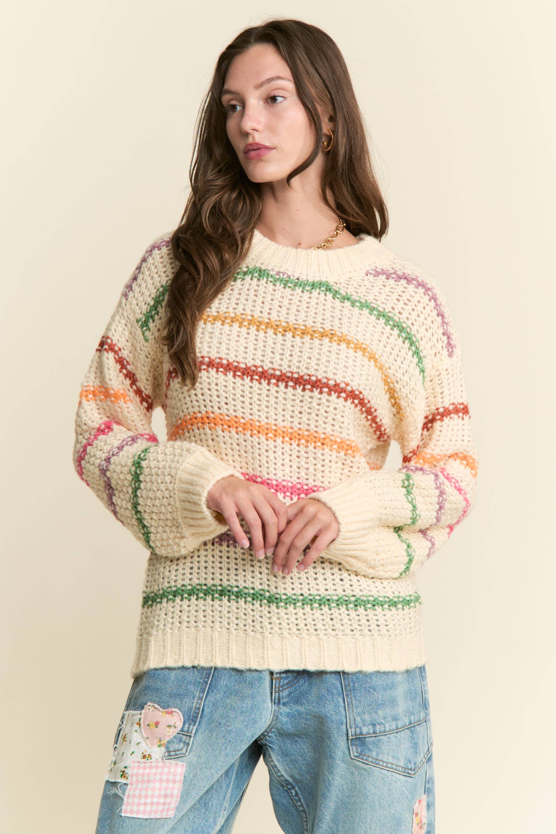 Elevate your wardrobe with this striking women's sweater, featuring a bold multi-color stripe design crafted from chunky knit fabric. Perfect for layering or wearing solo, this piece combines comfort with eye-catching style that effortlessly transitions from casual outings to cozy gatherings. The textured knit construction adds dimension and warmth, making it an essential addition to any season's collection.