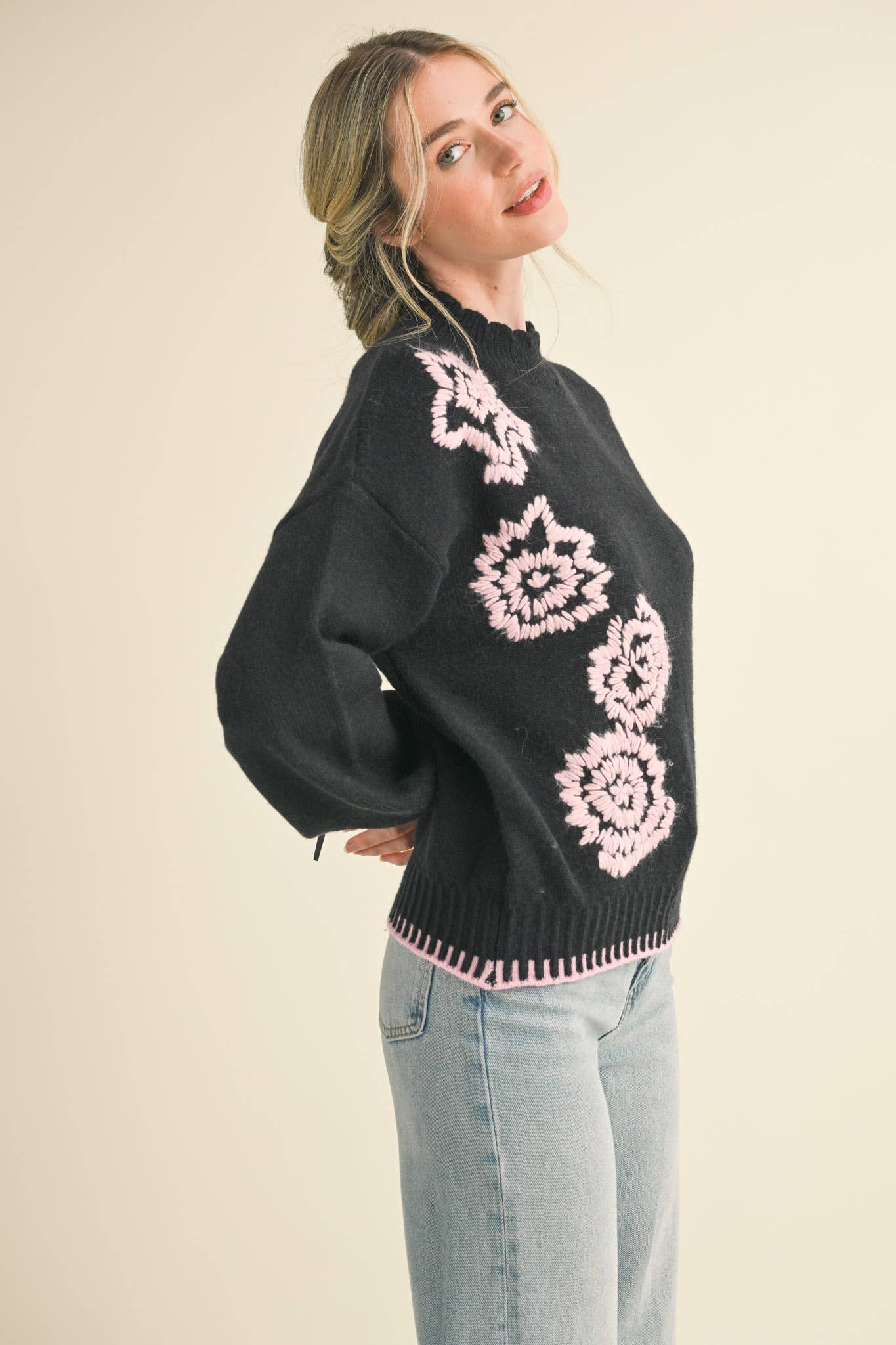 The Grace sweater elevates autumn style with a soft knit and a delicate floral embroidery front.