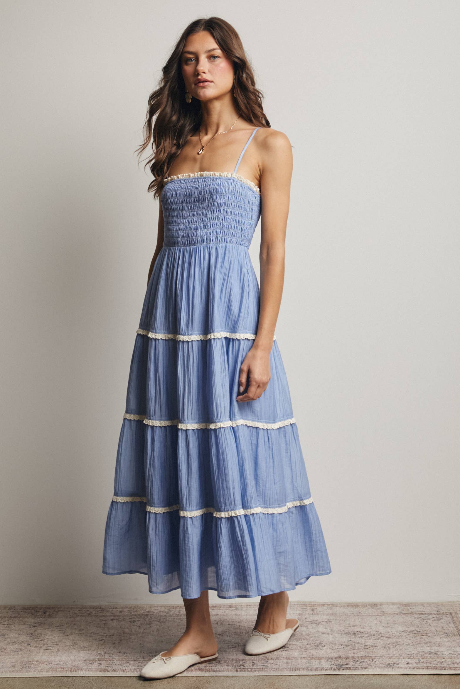 - Spaghetti straps and tiered skirt with contrast lace trim create a feminine, airy silhouette.